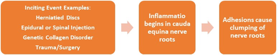 The gluing of cauda equina nerve roots and the arachnoid lining form an inflammatory, adhesive mass or clump that entraps nerves. The mass may erode through the entire spinal canal cover (arachnoid and dura) and cause spinal fluid to leak into tissues between the spine and skin over the lower back. The mass causes intense pain, nerve root dysfunction, and interferes with spinal fluid flow which causes symptoms including headache, blurred vision, dizziness, ringing in ears, and poor balance.